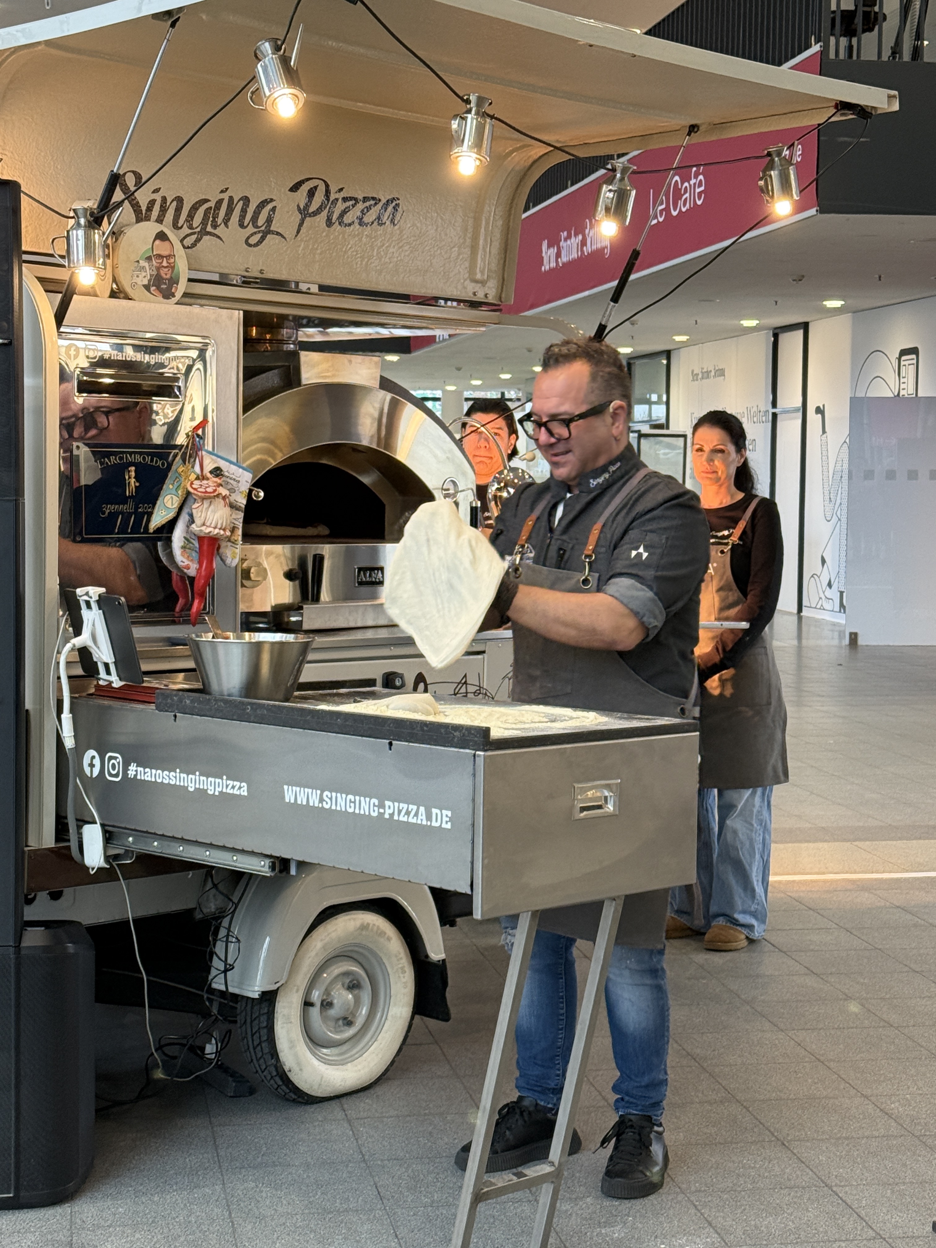 Begleitet von italienischen Klängen lag plötzlich der Duft frisch gebackener Pizzen in der Luft. Mit „Naro’s Singing Pizza“ zieht ein Stück mediterrane Lebensfreude durch die Messehallen: Knusprige Pizzen Margherita oder Salami stärken Galerie-Verantwortliche und Künstler inmitten des Aufbaus. Ein Higlight: Naro sang dazu.