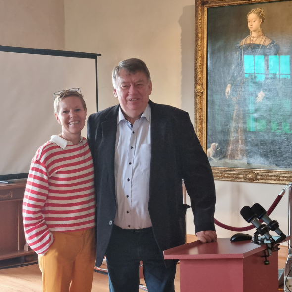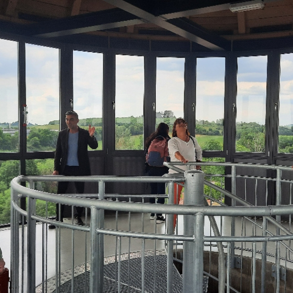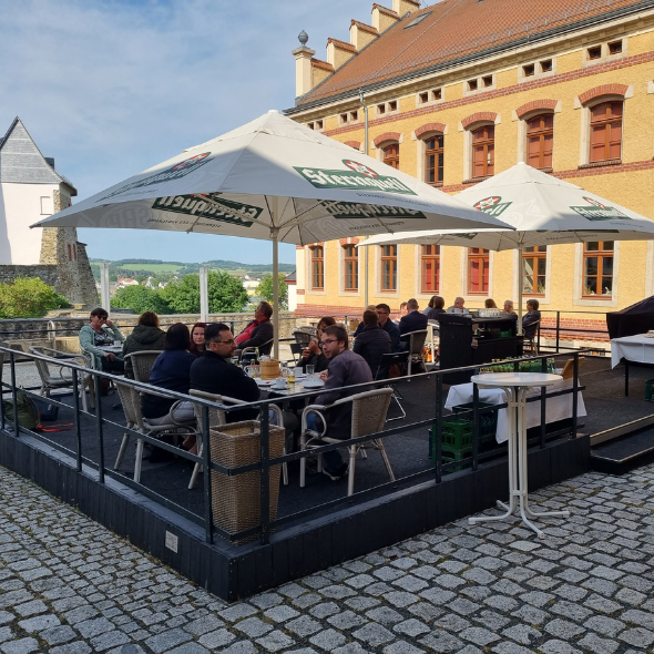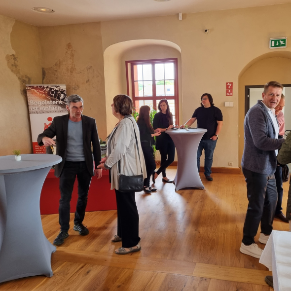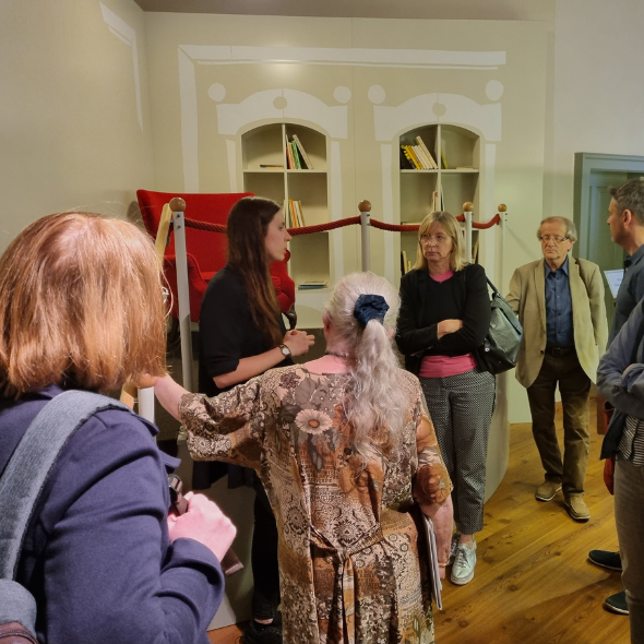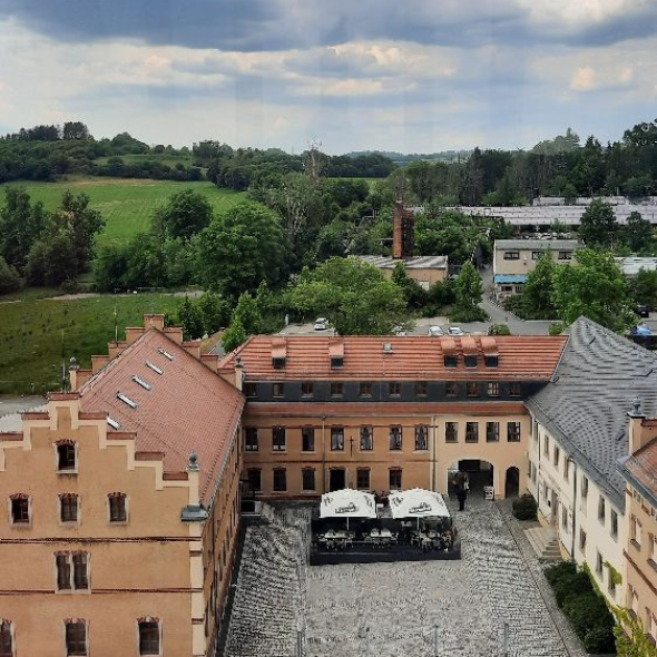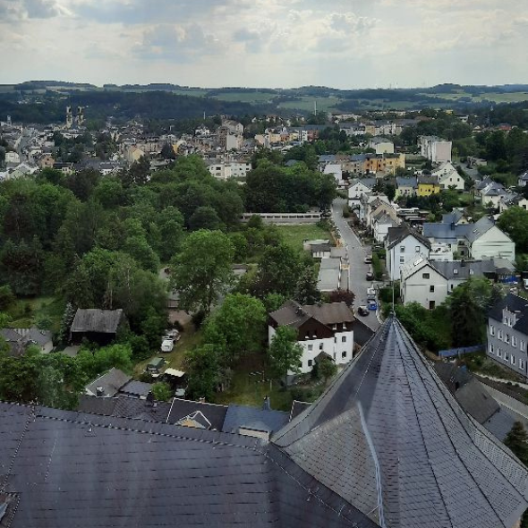 Der Nachmittag stand im Zeichen von Museumsbesichtigungen. Die Teilnehmer konnten sich zwischen drei Führungen entscheiden: So ging es entweder ins Teppichmuseum, Illusorium oder die Teilnehmer konnten den 31 Meter hohen Bergfried erklimmen. Das Illusorium befasst sich mit dem Lebenswerk der bekannten (Kinder-) Buchillustratorin Regine Heineke auf Schloss Voigtsberg. Im Gegensatz dazu ermöglicht der 2022 neu eröffnete Bergfried einen beeindruckenden Ausblick auf die Sperkenstadt und das Umland. Er ist zudem auch der höchste Punkt über Oelsnitz. Aber Achtung: Es sind 123 Stufen zu bewältigen.