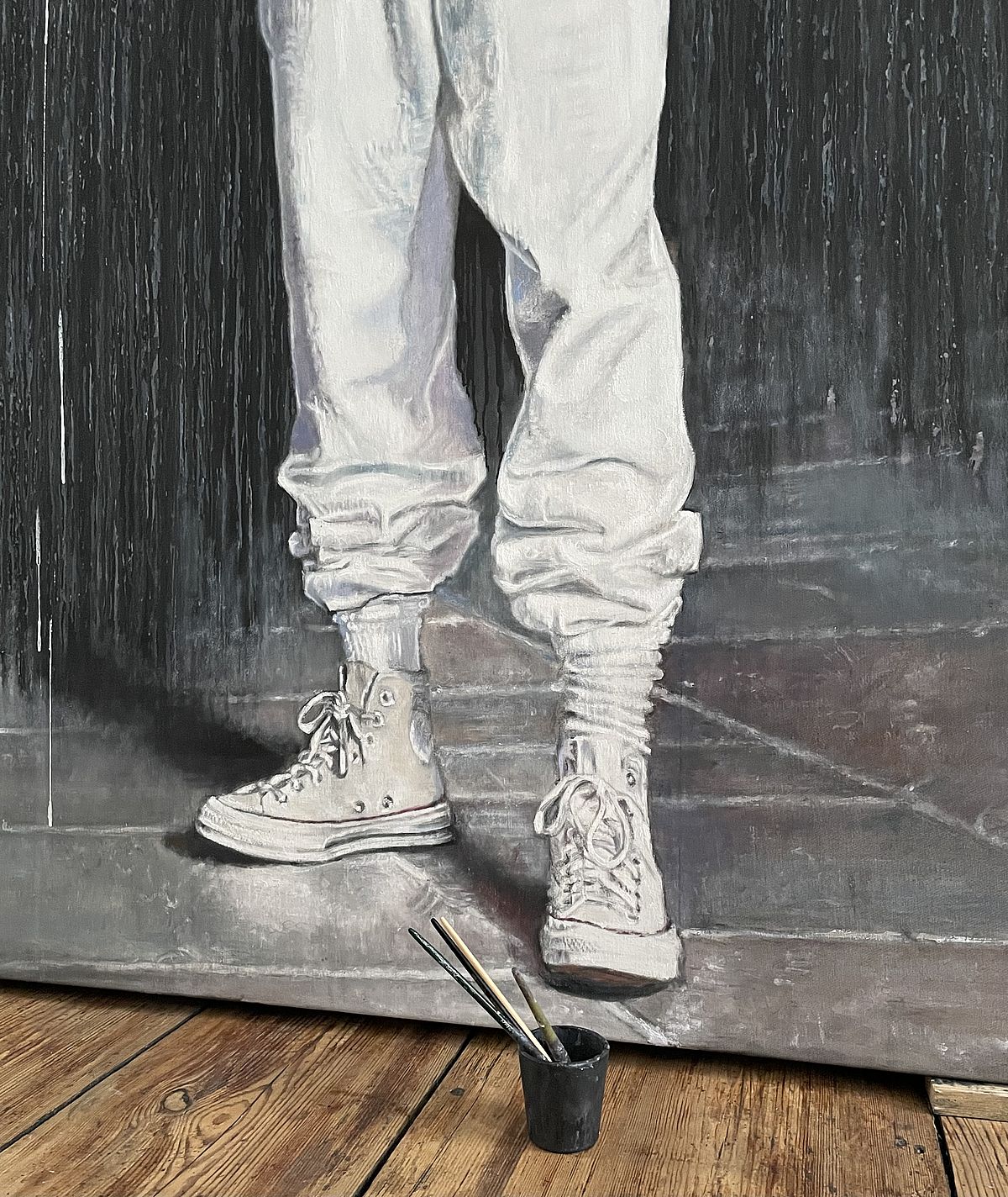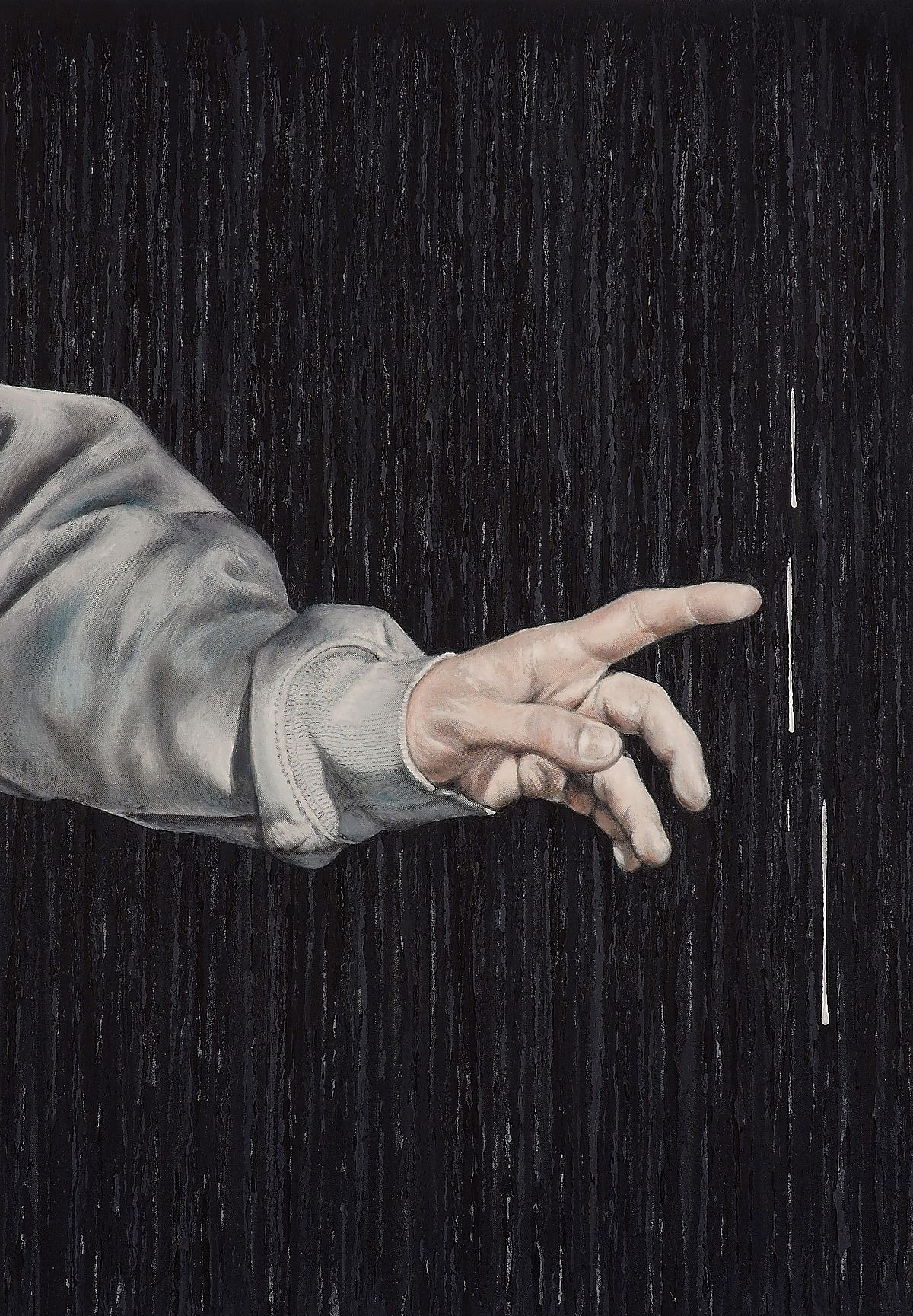 In meiner Malerei hinterfrage, verändere und entwickele ich ständig Dinge. Vor ein paar Jahren noch habe ich fotorealistischer gemalt. Außerdem habe ich Teile meiner Bilder mit weißen Auslassungen versehen. Davon bin ich weitgehend abgerückt. Ich setze zwar immer noch weiße Störfelder ein, allerdings eher fließende Partien und Tropfen, die das Motiv und den Betrachter irritieren. Darüber hinaus gebe ich meinen Figuren heute eine recht komplizierte Struktur. Manch einen erinnern diese Muster an Halbleiterchips, an Pixel oder Hieroglyphen. Aus der Nähe betrachtet, sind es abstrakte Formen. Erst wenn man zurücktritt, setzt sich alles zu einem mehr oder weniger fotorealistischen Bild zusammen. Das hat sich langsam entwickelt, weil mich der Gedanke interessiert, dass unsere Welt auf der Makroebene ganz anders funktioniert, als auf der mikroskopischen Ebene – das kennen wir aus der Quantenphysik. Hier gibt es so etwas wie Zufall und Chaos. Schaut man aus der Distanz auf den Makrokosmos, unsere wahrnehmbare Wirklichkeit und die Natur, entsteht aus Ungeordnetheit Klarheit.