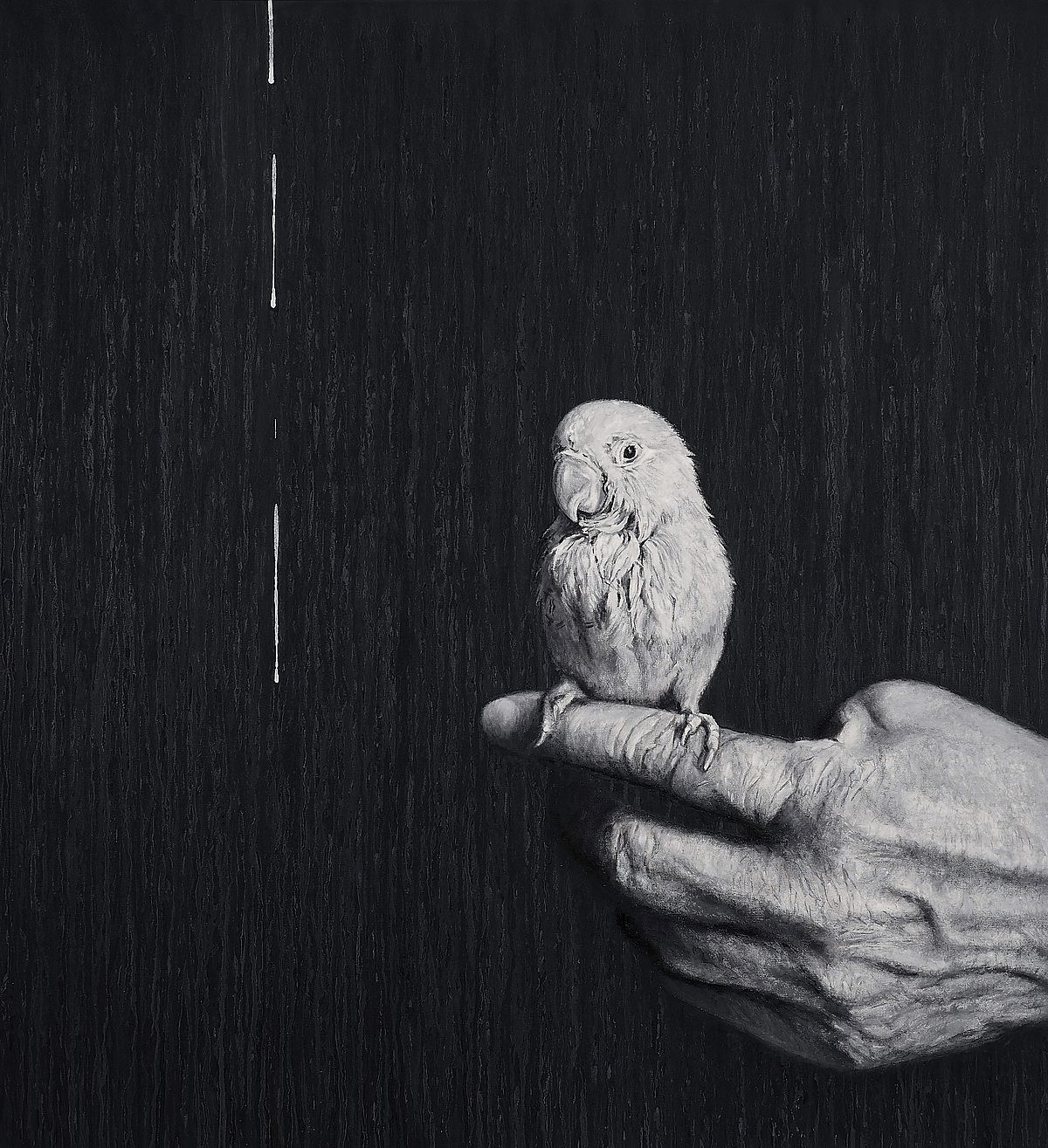 Neben der messbaren Zeit, die linear fortlaufend ist, gibt es nämlich eine subjektive Wahrnehmung von Zeit. Ich denke, dass es einen Zustand von Geistesgegenwart gibt, in dem ein Mensch die Verfasstheit seiner Umwelt, seines Körpers und seines Gemüts erfahren kann, ohne abgelenkt zu sein. Betrachten und Bewusstwerden, hohe Konzentration führt dazu, den Augenblick zu würdigen. Konzentration ist eigentlich das falsche Wort, es geht mir um eine umfassende, hellwache Offenheit für die gesamte Fülle der Wahrnehmung. Das zeige ich in meinen Bildern, die Betrachtung des gegenwärtigen Moments. Und es geht um das Finden einer Stabilität darin. Meine Figuren, meine Helden - das sind manchmal übrigens auch Tiere als Stellvertreter - stehen immer alleine, gewissermaßen im Regen. Vor diesem dunklen Regen heben sich einzelne weiße Tropfen ab. Sie stehen sinnbildlich für das Verstreichen von Zeit, gelegentlich auch für ein Geräusch, die Emotion eines Augenblicks, usw. - immer jedenfalls für etwas Flüchtiges. Aber meine Figuren verweilen da im Angesicht von Tropfen und Fließen ganz stabil und in Harmonie, in einem Gleichgewicht, in Kontemplation, sie nehmen den gegenwärtigen Moment wahr, betrachten ihn und halten ihn tatsächlich an. Aus Utopie wird in der Kunst Wirklichkeit und aus eigener Anschauung kann ich sagen, dass es eben doch möglich ist, die Zeit anzuhalten. Man muss nur genug üben.