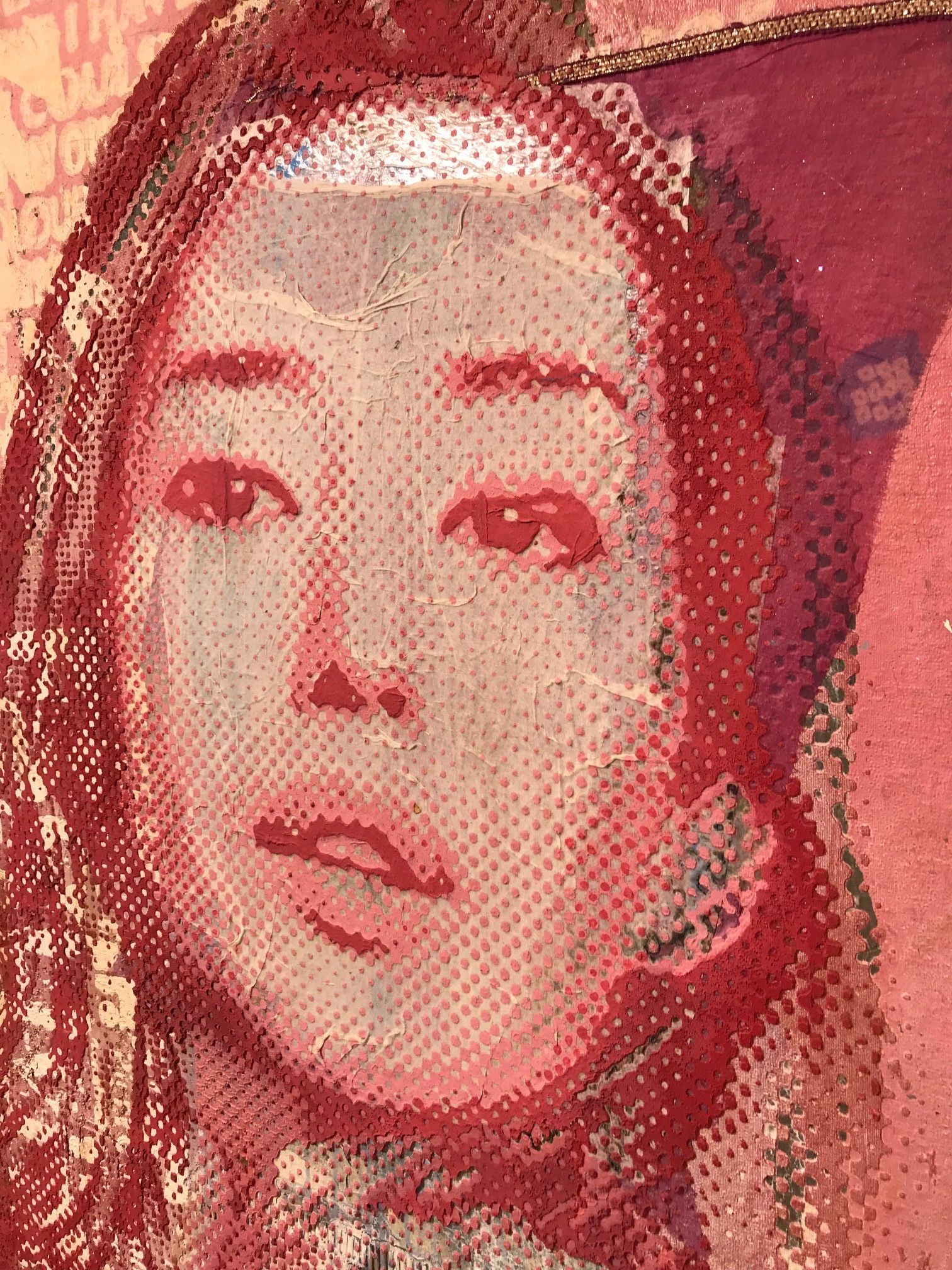 Die Ästhetik der Oberfläche. Die Gesichter der Frauen konkretisieren sich erst aus der Distanz. Von Nahem fallen die unterschiedlichen und ungewöhnlichen Materialien auf, die den Betrachter zum Nachdenken anregen. Dennoch, die Porträts haben primär etwas Schönes.